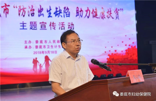 为进一步规范开展全市出生缺陷综合防治工作,宣传普及出生缺陷防治知识,强化群众对预防出生缺陷重要性的认识,切实降低出生缺陷发生率,有效提高出生人口素质。9月18日,娄底市举办2018“防治出生缺陷 助力健康扶贫”主题宣传活动。国家卫健委妇幼司巡视员王巧梅,住湘全国政协委员、省卫生计生委副主任易露茜,市委副书记、市人民政府市长杨懿文,市人大常委会副主任彭增光,中国出生缺陷干预救助基金会副秘书长薛敬洁,市政协副主席席伏应,中国出生缺陷干预救助基金会基金部主任王紫薇,省卫生计生委妇幼健康处副处长王璋华,省妇幼保健院副院长王华,市卫生计生委党组书记、主任罗琳等领导出席,市卫生计生委全体班子成员,市直医疗机构、各县市区卫生计生局、妇幼保健院相关人员计450人参加。市人民政府副市长方建荣主持。
